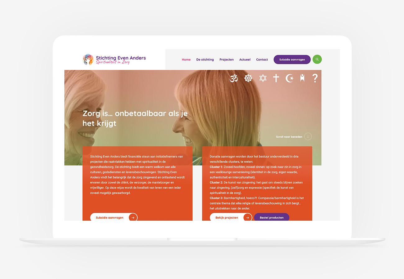 Stichting Even Anders biedt financiële steun aan initiatiefnemers van projecten die raakvlakken hebben met spiritualiteit in de gezondheidszorg. De stichting biedt een warm welkom aan alle culturen, godsdiensten en levensbeschouwingen. Stichting Even Anders vindt het belangrijk dat de zorg zingevend en ontlastend wordt ervaren door zowel de cliënt, de verzorger, de mantelzorger en vrijwilliger. Op deze wijze wordt de kwaliteit van leven van een ieder zoveel mogelijk gewaarborgd.