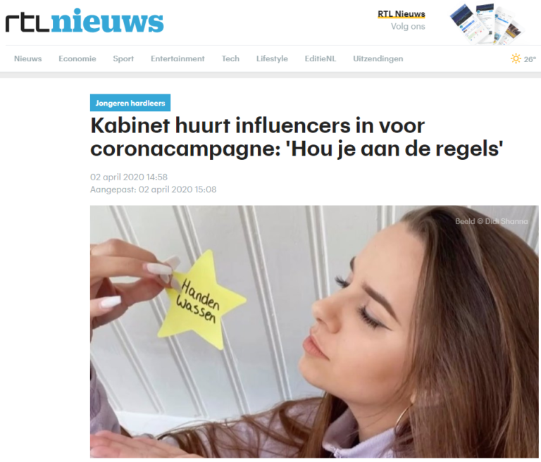 Niet alleen commerciële bedrijven wagen zich aan influencer marketing. Tijdens de coronacrisis zagen we zelfs dat influencers werden ingezet door de overheid om de maatregelen omtrent de lockdown te laden landen bij de Nederlanders.